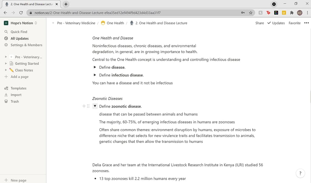 In the past year, I have come to really appreciate the concept of active recall. Active recall has been said to help people efficiently practice material and commit information to memory. And Notion is the perfect application to help you do just that! It has an awesome toggle feature where you can go through the notes your professor gives, create questions, open the toggle and insert the correct answer along with appropriate images, links, etc.
